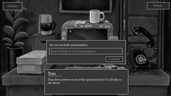 Thanks for your nice game!Really liked this for as simple as it was, short and a nice effective mystery! Did get a lil stuck with trying to input the text, but honestly it didn’t really hamper anything.